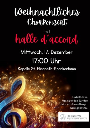 Im Anschluss an eine musikalische Runde durch die Sationen des Elisabeth Krankenhauses in Halle, lädt halle d´accord um 19:00 Uhr herzlich zu einem Benefizkonzert zu Gunsten des Hospizes in die Kapelle des Krankenhauses ein.